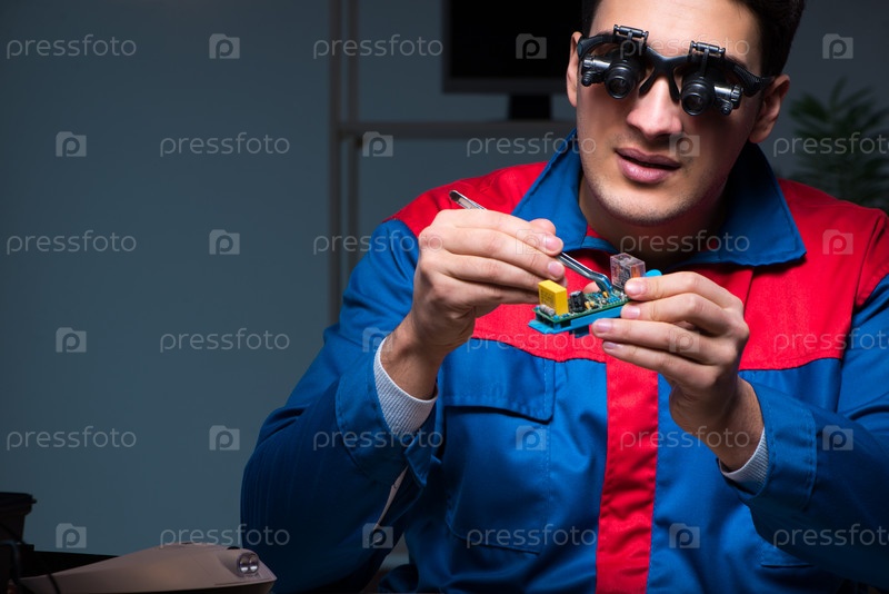 Компьютерный специалист, ремонтирующий ПК поздно ночью