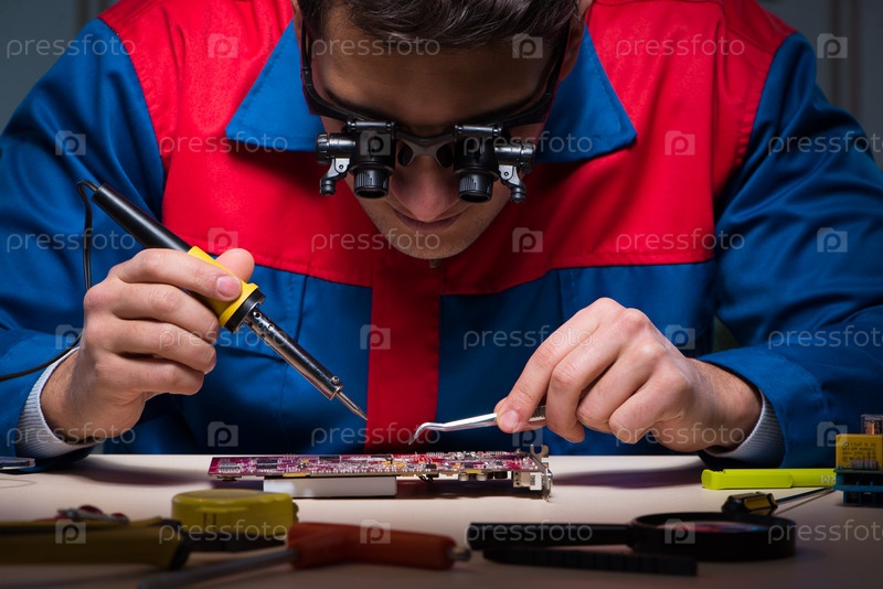 Компьютерный специалист, ремонтирующий ПК поздно ночью