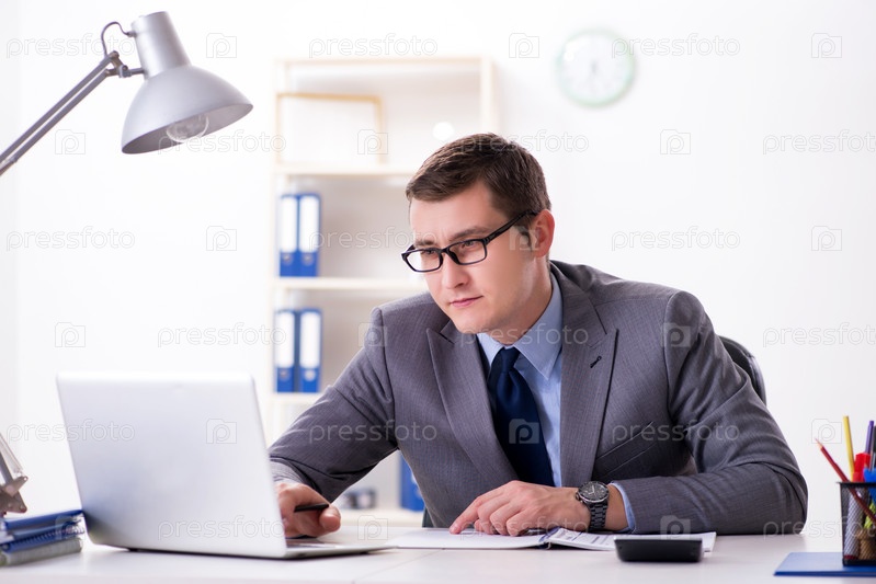 Молодой привлекательный бизнесмен-сотрудник, работающий в офисе за столом