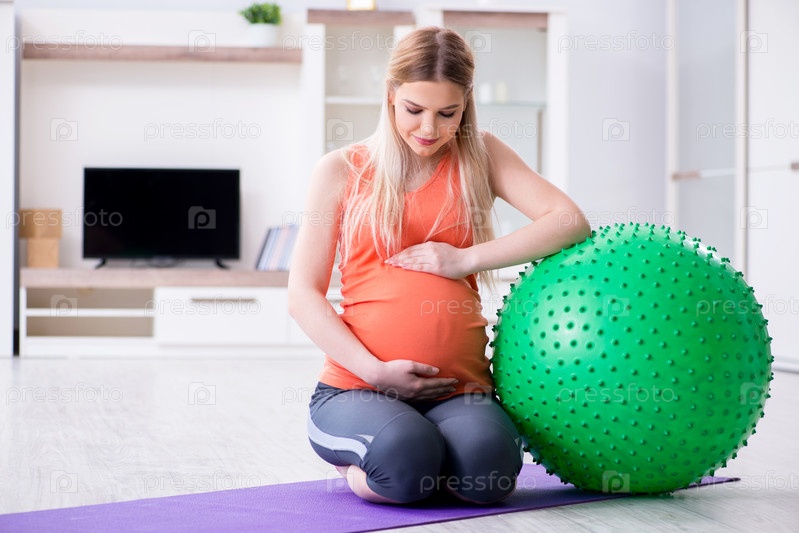 Молодая женщина, готовящаяся к родам, тренируется дома