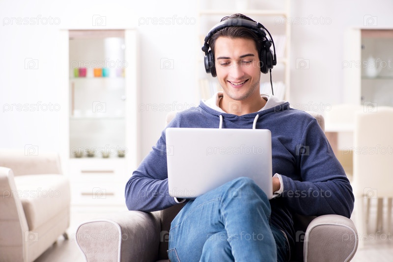 Молодой красавчик слушает музыку с наушниками