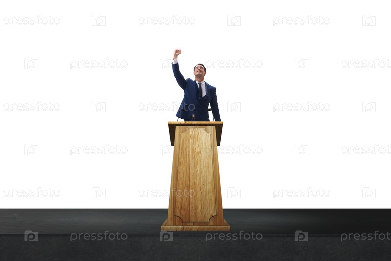 Бизнесмен выступает с речью на трибуне в бизнес-концепции