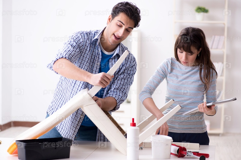 Жена помогает мужу починить разбитый стул дома