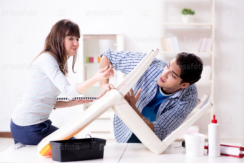 Жена помогает мужу починить разбитый стул дома