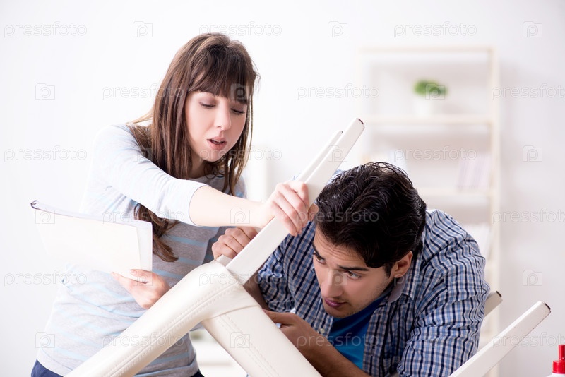 Жена помогает мужу починить разбитый стул дома