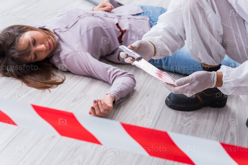 Судебный следователь на месте преступления расследует убийство женщины