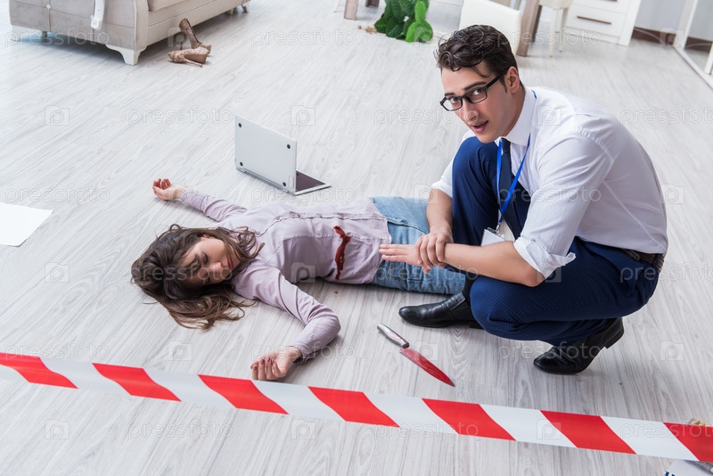 Судебный следователь на месте преступления расследует убийство женщины