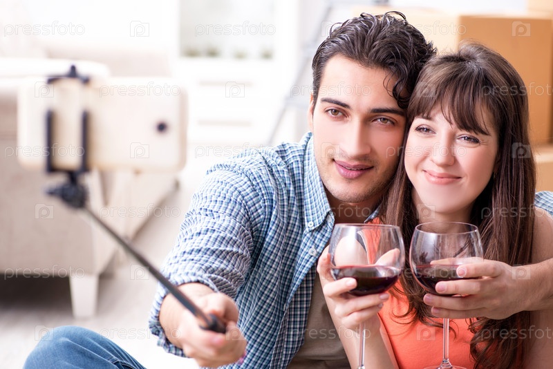 Пара делает селфи и пьет вино