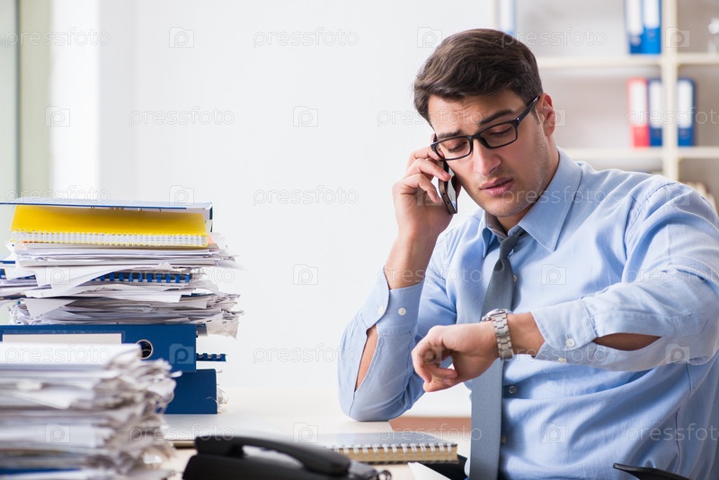 Чрезвычайно занятый бизнесмен, работающий в офисе