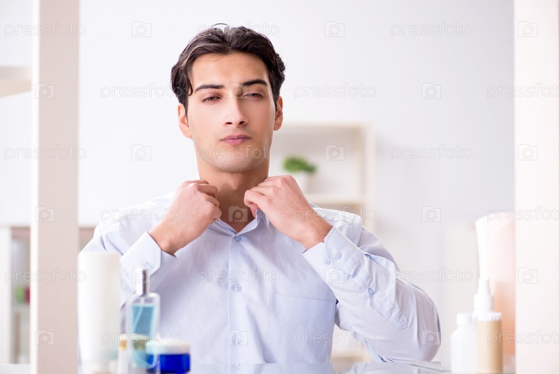 Мужчина одевается на работу в ванной