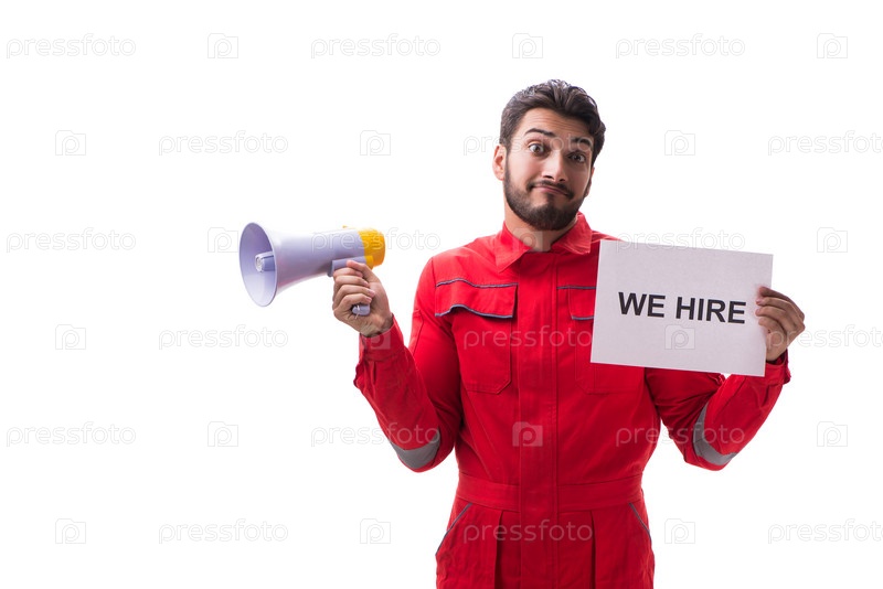 Мужчина в комбинезонах с посланием, изолированным на белом