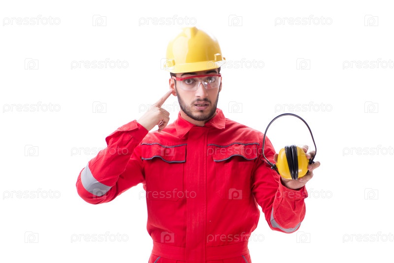 Молодой работник с наушниками, отменяющими шум на белом