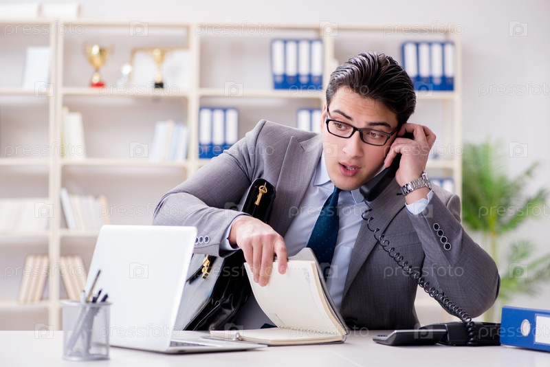 Работник бизнесмена разговаривает по офисному телефону