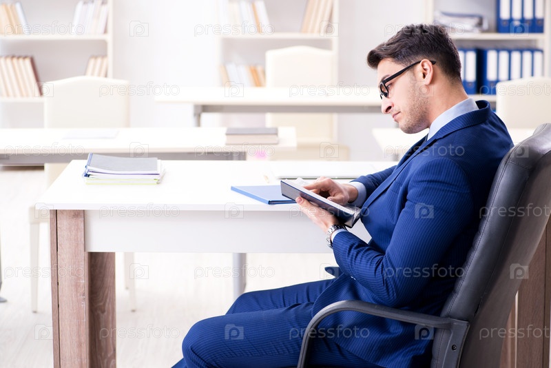 Молодой привлекательный бизнесмен-сотрудник, работающий в офисе за столом