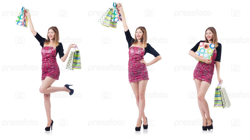 Молодая девушка после хороших покупок на белом