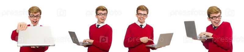 Студент, использующий ноутбук изолированный на белом