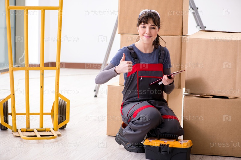 Женщина-подрядчик перемещает коробки в концепции переноса
