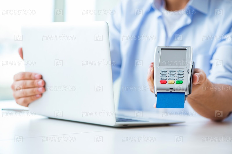 Человек обрабатывает транзакции по кредитным картам с POS-терминалом