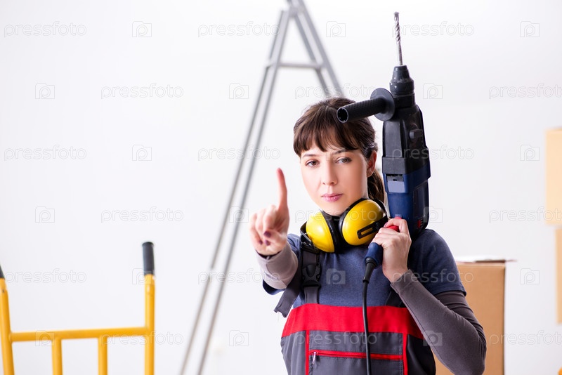 Женщина-подрядчик с ручной дрелью на строительной площадке