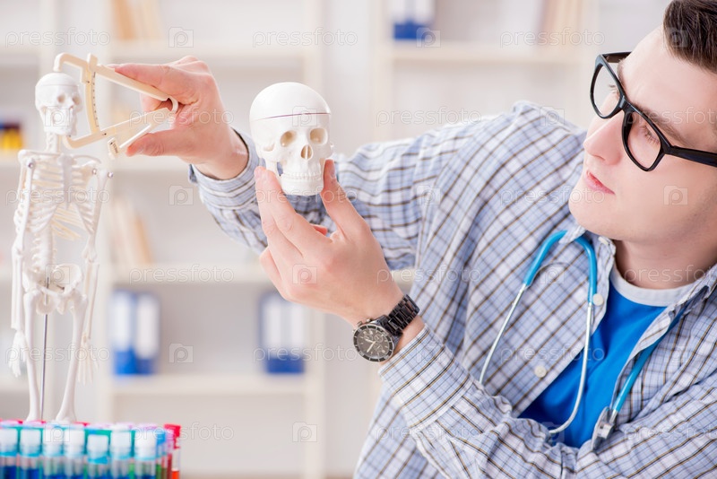 Студент-медик изучает скелет в классе во время лекции