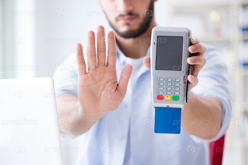 Человек обрабатывает транзакции по кредитным картам с POS-терминалом