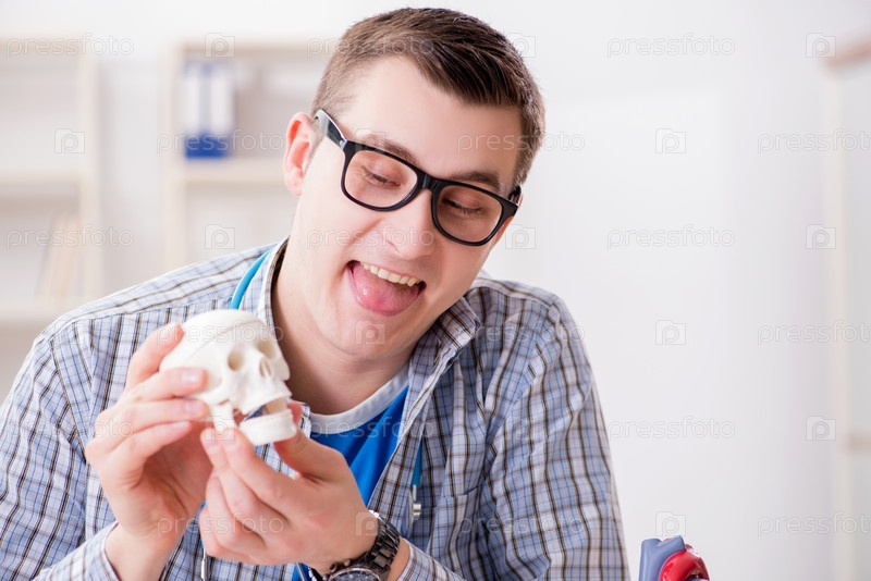Студент-медик изучает скелет в классе во время лекции