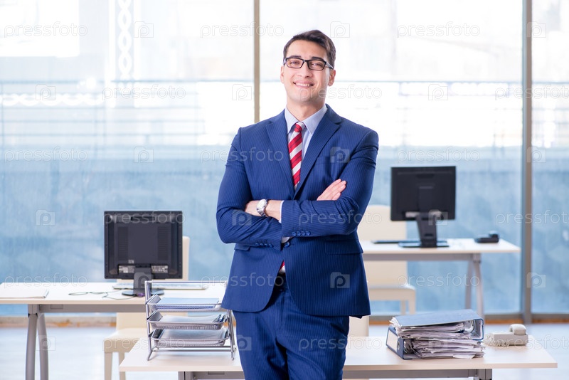 Молодой привлекательный бизнесмен-сотрудник, работающий в офисе за столом