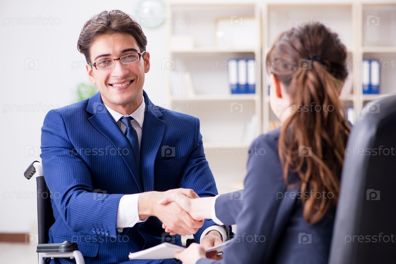 Инвалидный бизнесмен обсуждает с коллегой