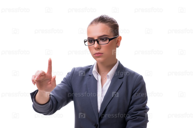 Молодая бизнесвуменка нажимает виртуальную кнопку на белом