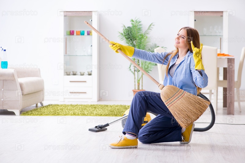 Молодая женщина убирает пол дома, выполняя домашние задания
