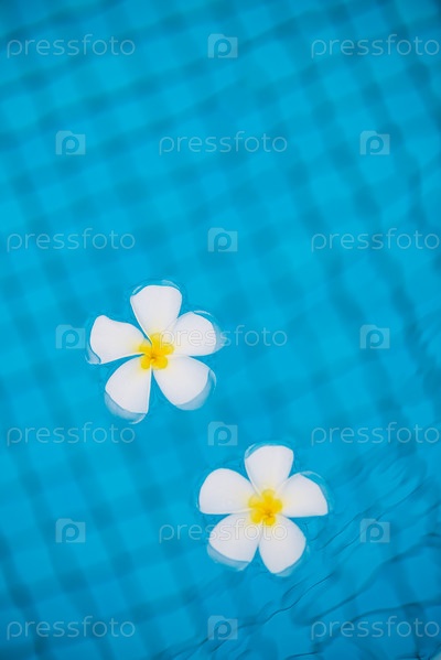 Плюмерия цветы на голубой воде в бассейне