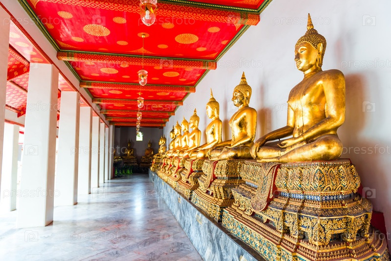 Статуи сидящего Будды вдоль стены в храме