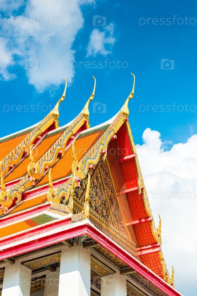 Крыша храма Таиланда с острыми пиками на фоне голубого неба