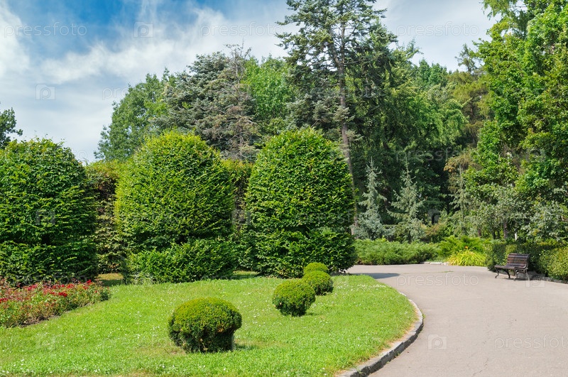 Парк, изгороди, зеленый луг и голубое небо