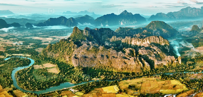 Вид с воздуха рисовых полей в скалистой горной долине