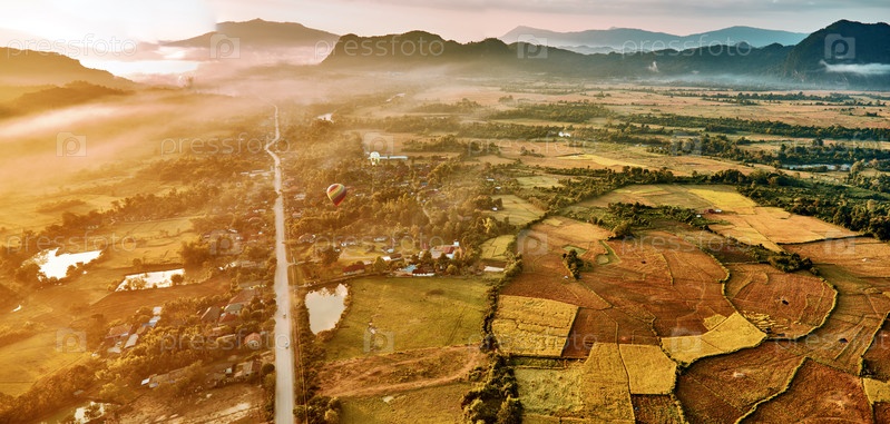 Аэрофотосъемка рисовых полей в скалистой горной долине