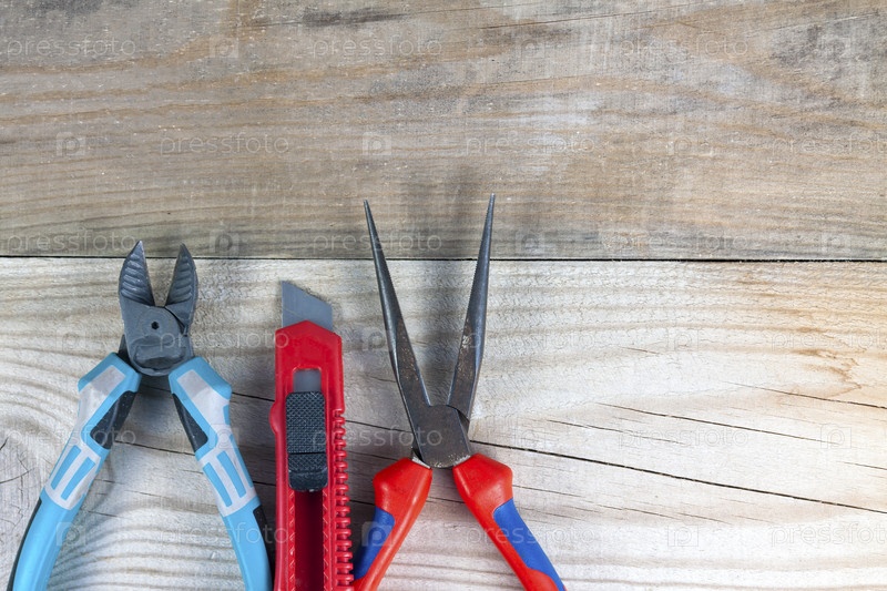 Старый рабочий инструмент на деревянном фоне