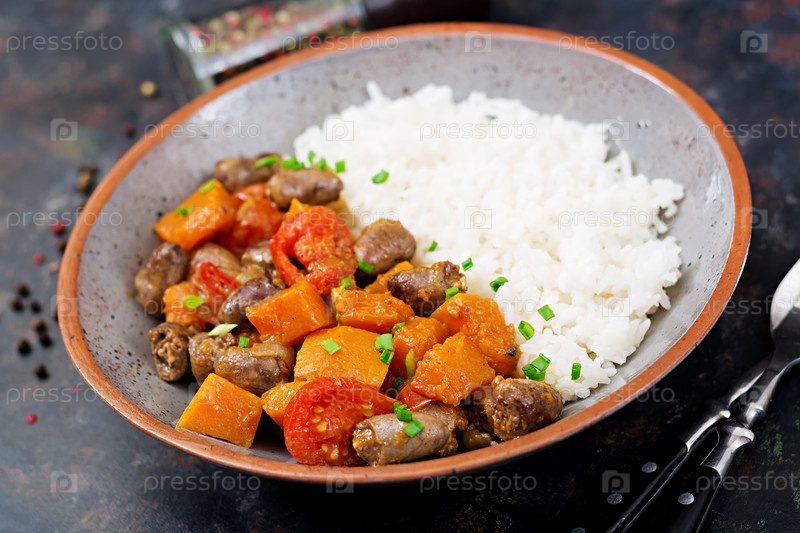 Куриные сердца с тыквой и помидорами в томатном соусе