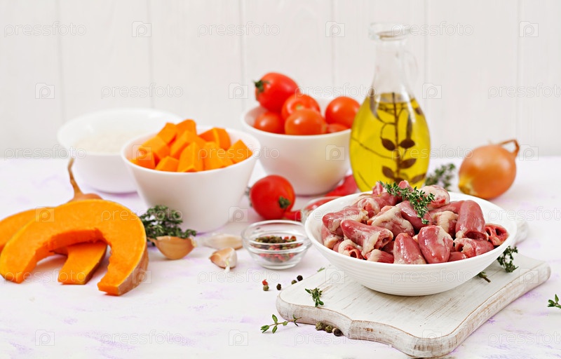 Ингредиенты для приготовления куриного сердца с тыквой и помидорами в томатном соусе