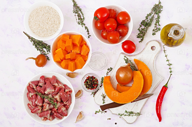 Ингредиенты для приготовления куриного сердца с тыквой и помидорами в томатном соусе