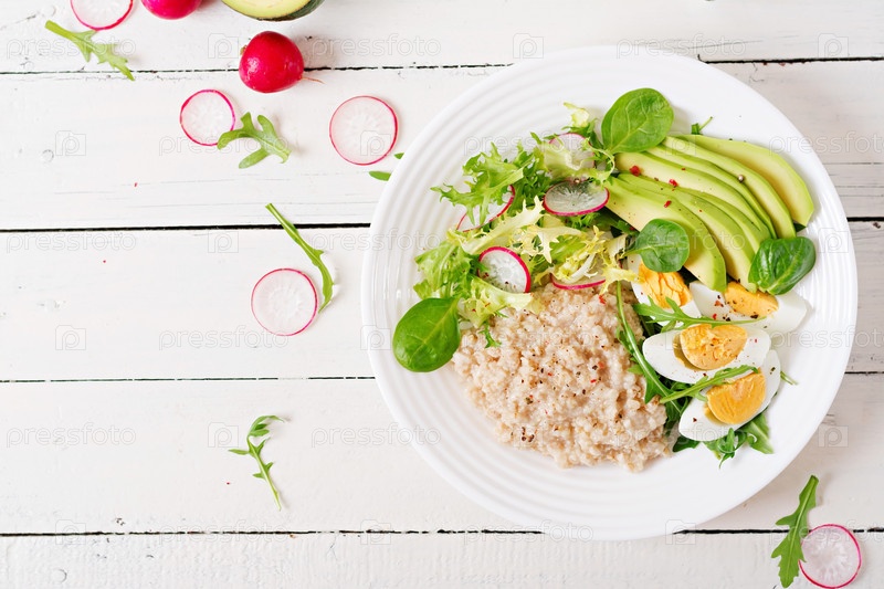 Здоровый завтрак. Диетическое меню. Овсяная каша и салат из авокадо и яйца. Вид сверху