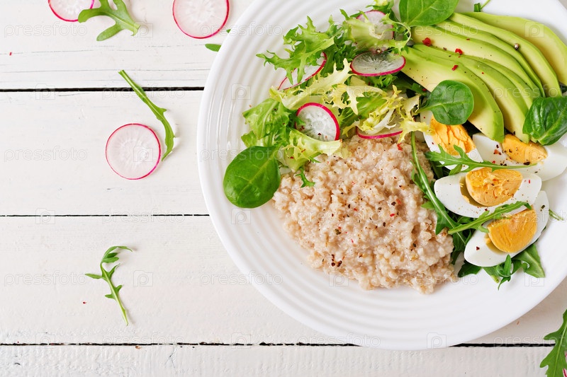 Здоровый завтрак. Диетическое меню. Овсяная каша и салат из авокадо и яйца. Вид сверху