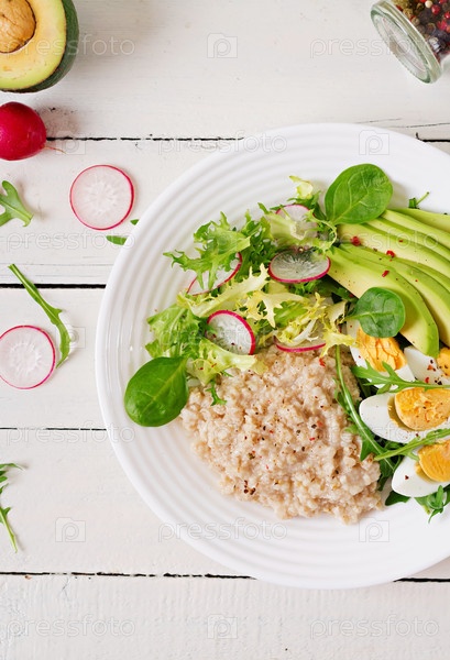 Здоровый завтрак. Диетическое меню. Овсяная каша и салат из авокадо и яйца. Вид сверху