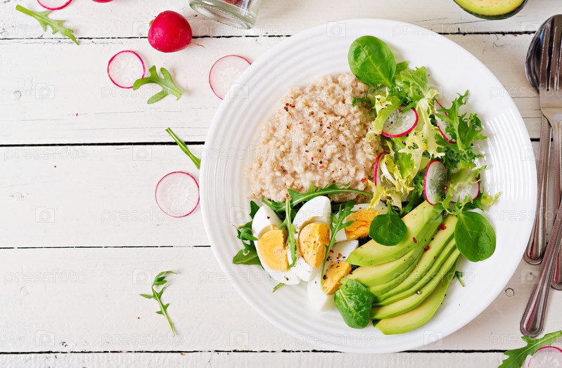 Здоровый завтрак. Диетическое меню. Овсяная каша и салат из авокадо и яйца. Вид сверху