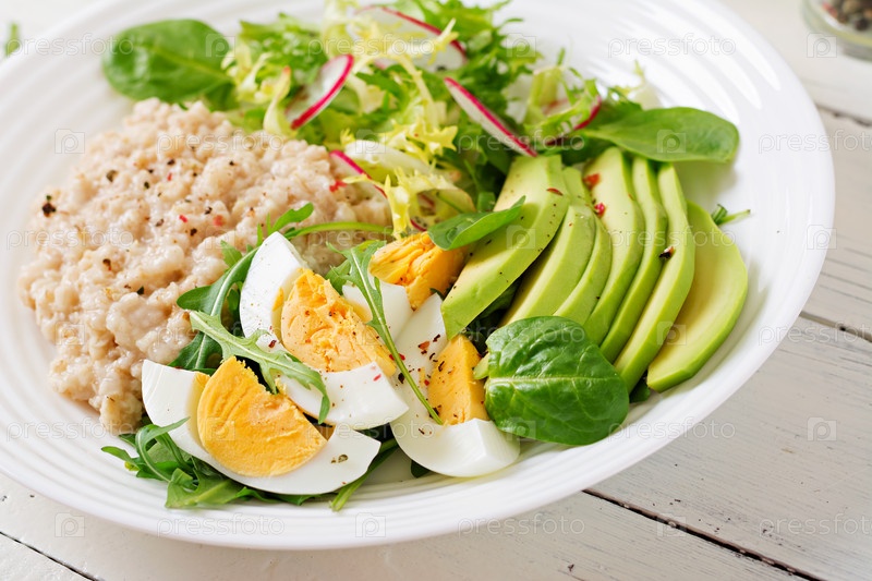 Здоровый завтрак. Диетическое меню. Овсяная каша и салат из авокадо и яйца