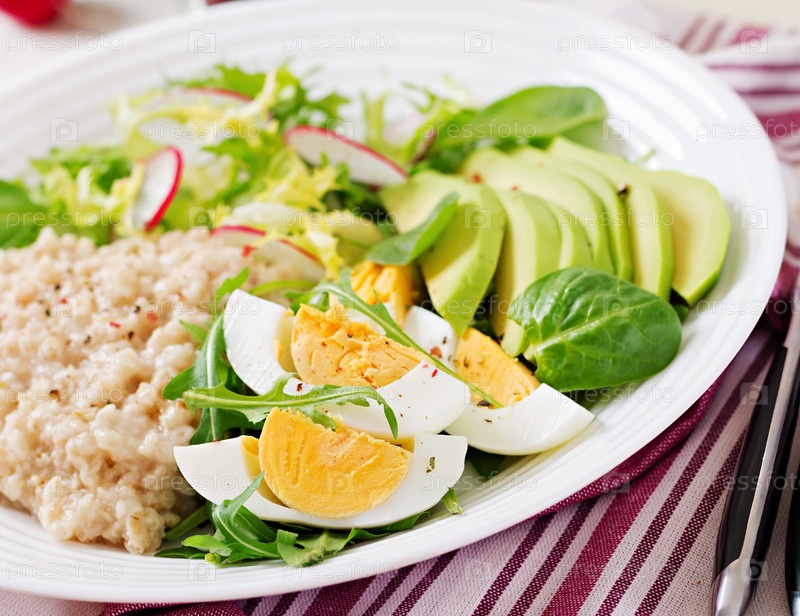 Здоровый завтрак. Диетическое меню. Овсяная каша и салат из авокадо и яйца