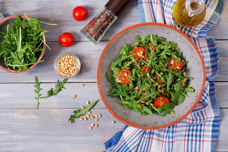 Здоровый салат с рукколой, помидорами и кедровыми орехами