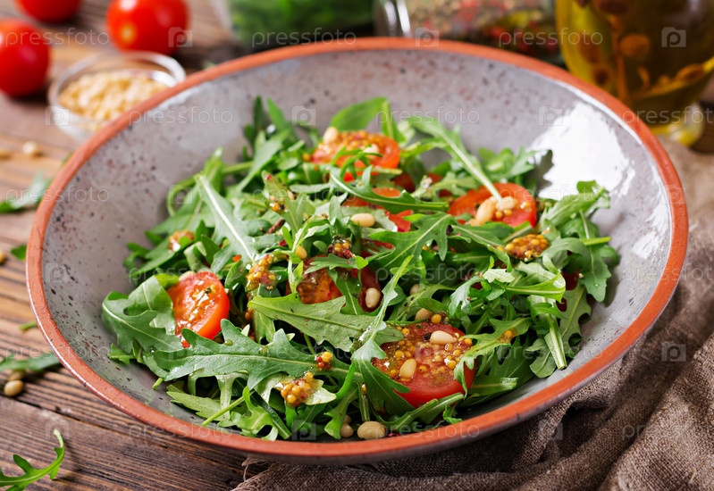 Здоровый салат с рукколой, помидорами и кедровыми орехами