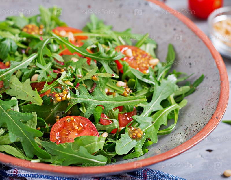 Здоровый салат с рукколой, помидорами и кедровыми орехами
