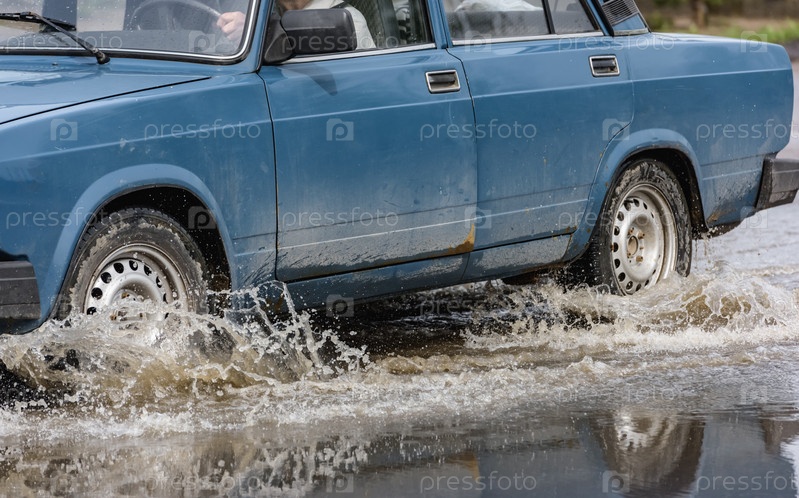 Автомобильная дождевая лужа брызгает водой